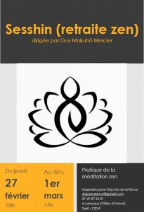 L’enseignement sera donné par Guy Mokuhô Mercier, moine zen, disciple de maître Taisen Deshimaru. La sesshin dure deux jours et demi. L’arrivée est prévue le jeudi 27 février 2020 vers 18h, repas du soir à 20h. Début de la sesshin le vendredi 28 au matin, départ le dimanche 1er mars vers 15h, après le repas.